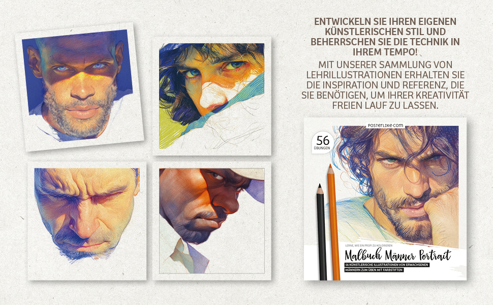 • 56 Männerporträts zum Kolorieren: Eine abwechslungsreiche Sammlung von Porträts, die verschiedene Gesichtszüge, Emotionen und Details zeigen.