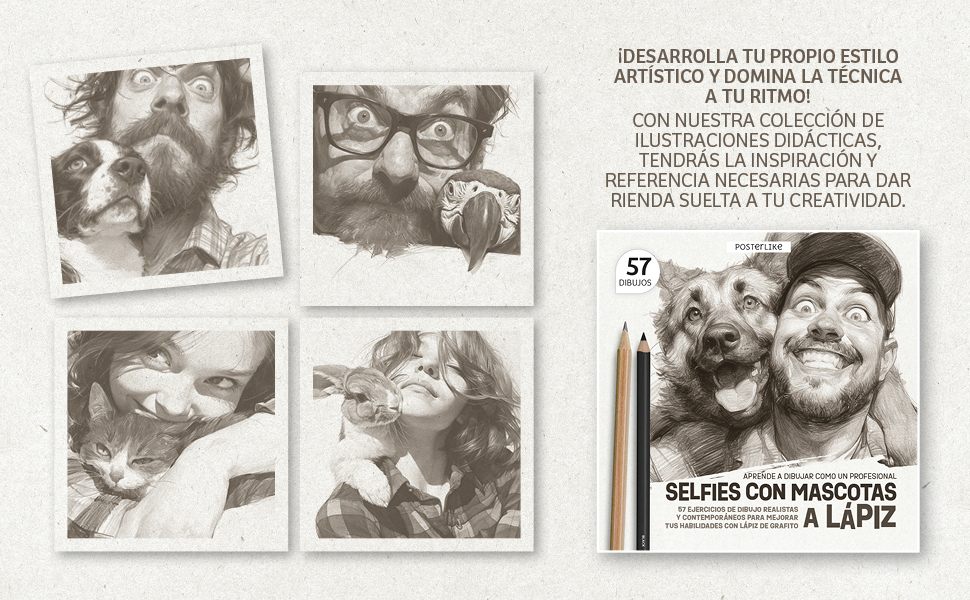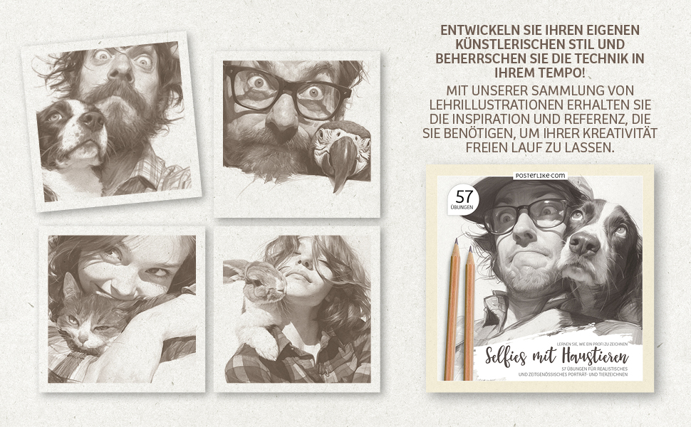 • 57 Übungen mit Selfies von Haustieren: Eine breite Palette von Szenen mit Hunden, Katzen, Papageien und mehr, die realistische und dynamische Zeichnungen ermöglichen.