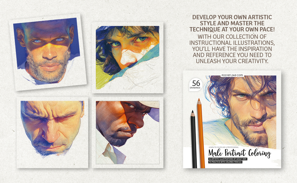 • 56 male portrait illustrations offering step-by-step guidance for coloring and defining realistic details.