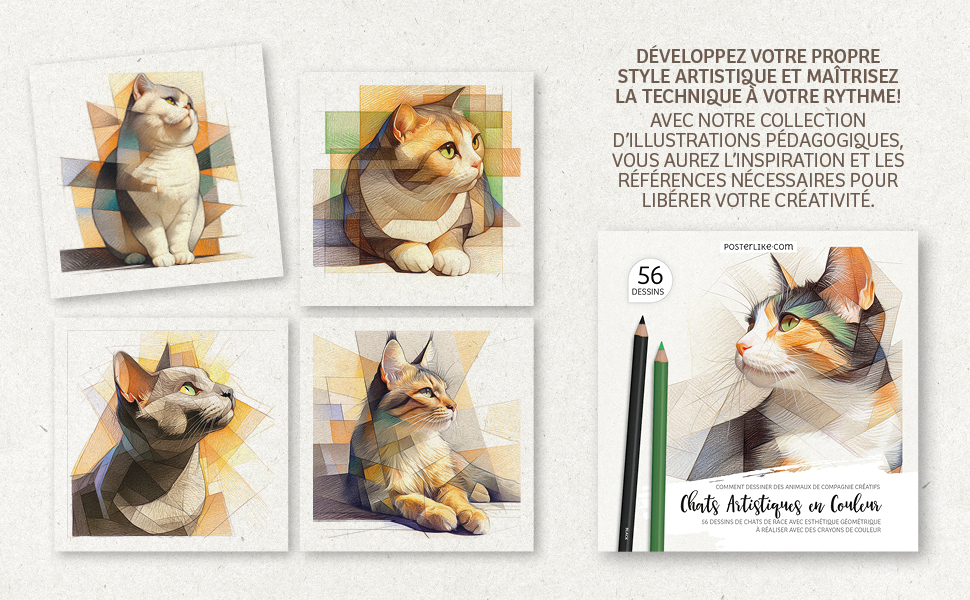 • 56 Illustrations de Chats Géométriques : Dessinez et coloriez une variété de chats de race dans des styles modernes, explorant formes, couleurs et textures.
