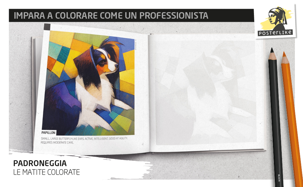 Ogni esercizio segue una struttura didattica: a sinistra, l’illustrazione di riferimento a colori; a destra, una zona di lavoro con grisaglia leggera per aiutarti a posizionare proporzioni e dettagli. Questo metodo consente di concentrarti su colori, texture e valori tonali, permettendoti di creare ritratti di cani unici e stilizzati.