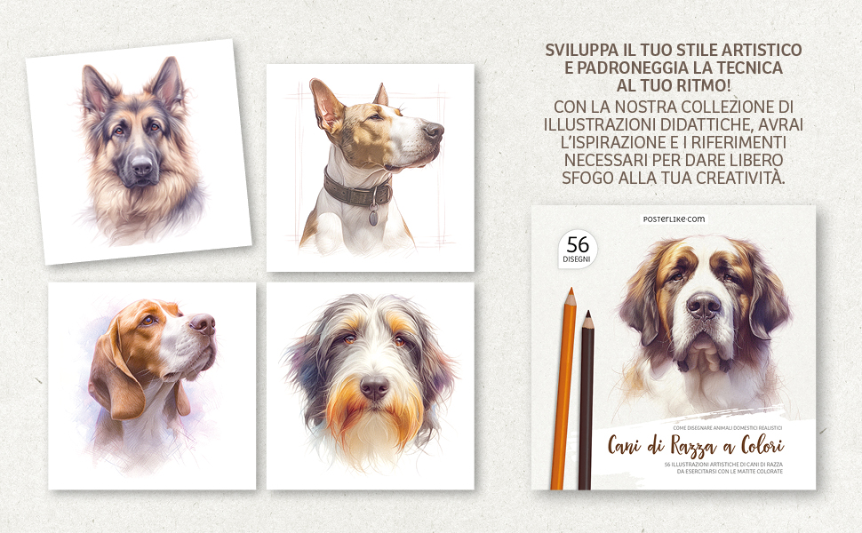 • 56 Illustrazioni di Cani in Stile Realistico : Ogni esercizio esplora una razza canina diversa, catturandone le caratteristiche distintive.