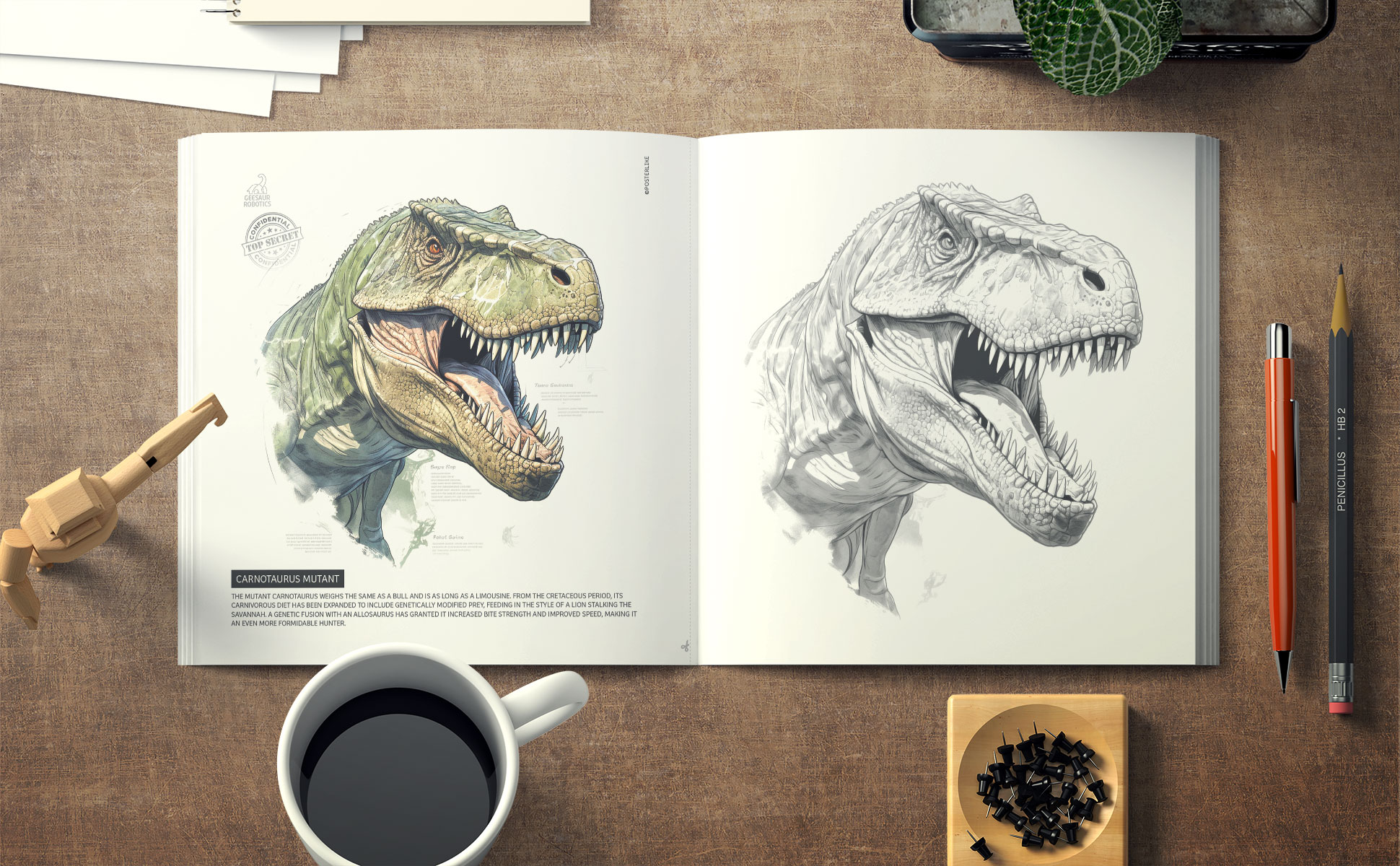 En los secretos laboratorios de GEESAUR, la prehistoria se entrelaza con la ingeniería genética al crear los Dinosaurios Mutantes: majestuosas criaturas clonadas que emergen como una amenaza sin precedentes para la humanidad. Este libro te revela su esencia pero tu juegas un papel crucial: mediante reproducciones realistas y científicas a lápiz, y su posterior difusión, tienes el poder de alertar y preparar al mundo ante este terrible desafío. Sumérgete en el fascinante mundo prehistórico con este libro de ejercicios prácticos de dibujo científico diseñado tanto para principiantes como para artistas experimentados. Sumérgete en el mundo prehistórico con este libro de ejercicios de dibujos científicos para colorear, diseñado tanto para principiantes como para artistas experimentados. Cada doble página presenta un detallado dibujo de un Dinosaurio Mutante a color en la izquierda, sirviendo como modelo, y una grisalla en la página derecha para que practiques y perfecciones tu técnica de coloreado.
